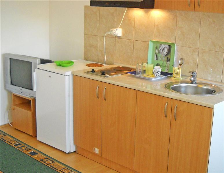 U sobi je francuski ležaj ( koji je moguće po potrebi rastaviti), prostrani plakar garderober i TV sa kablovskim programom. Kuhinja je u sklopu sobe, sa frižiderom, štednjakom bez rerne, te potrebnim posudjem za pripremu hrane I jelo.