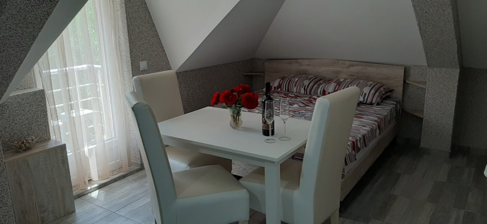 Obuhvata: Kuhinja: Čaše i tanjiri, Rešo, Frižider • Kupatilo: Peškiri • Spavaća soba: Posteljina • Dnevna soba: Ravan TV, Internet • Pogledi: Pogled na dvorište, Pogled na grad, Pogled na baštu, Pogled na planinu, Pogled na ulicu • Ostalo: Terasa