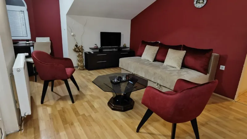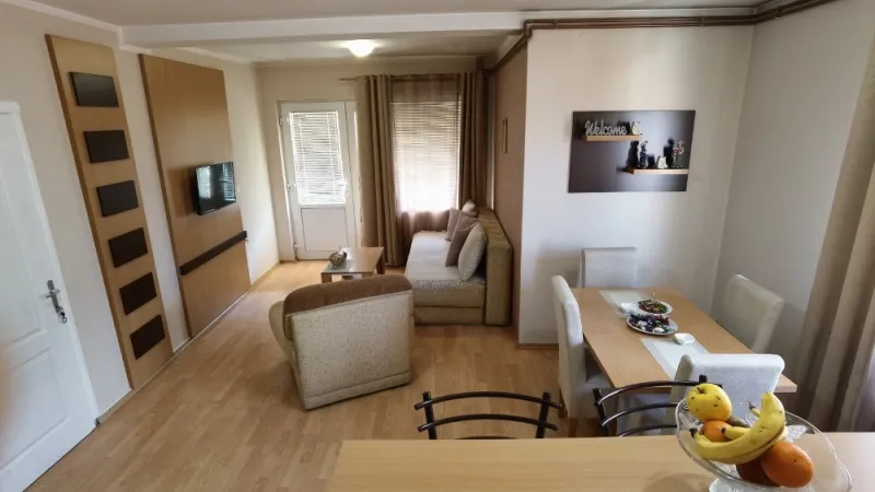 Obuhvata: veliku sobu sa francuskim ležajem, garderoberom, GROF na razvlačenje za dvoje, trpezariju sa kuhinjom i kupatilo.Poseduje KTV i parking obezbedjen u dvorištu.
