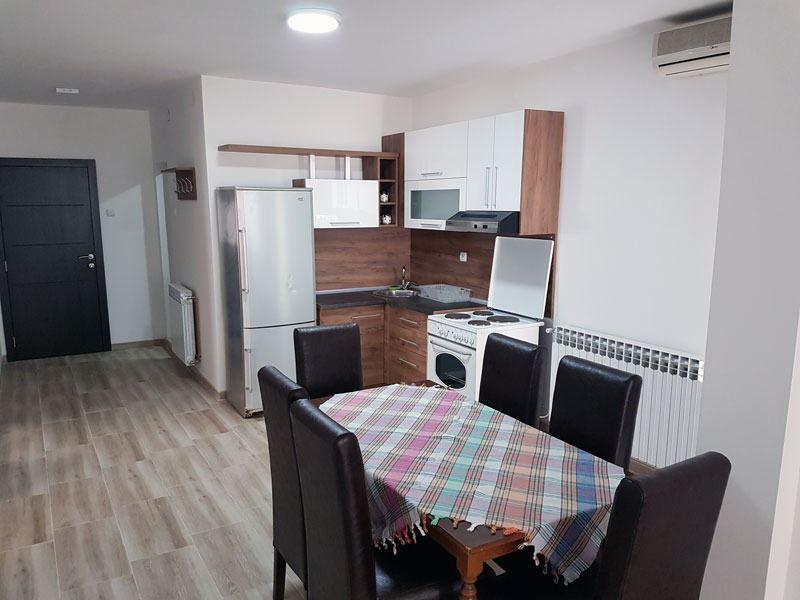 Obuhvata: dve spavaće sobe, dnevni boravak sa KTV, wi-fi internet, dva dvoseda u dnevnom boravku koja se razvlače, kuhinja sa trpezarijom, KLIMA, grejanje, kupatilo sa tuš kabinom, terasa, parking mesto.